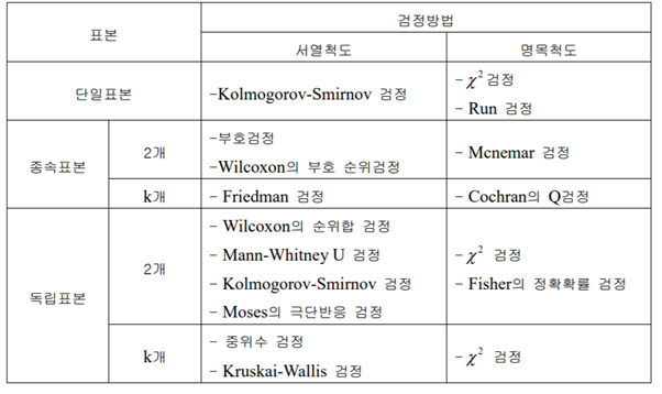 이와 반대로, 비모수적 통계 기법이란 모집단의 모수성을 가정을 하지 않고 하는 방법이다. 주로 표본의 수가 적을 때 사용되며 모집단의 분포를 모르거나 ‘중앙값’에 의해 더 잘 설명이 되는 경우에 사용한다. 비모수적 통계 기법의 장점으로는 분포의 가정이 완화되어 있으므로 어떠한 형태의 모집단에 대한 비교도 가능하다는 점이다. 또한 실제의 양적 관측치에 의존하지 않고 이들의 ‘상대적 평가’에 의존하므로 이상 값의 영향을 감소시킨다는 장점이 있다. 비모수적 통계 기법에 해당하는 검정 방법으로는 카이자승검정이 있으며 최근에는 ANOVA나 회귀분석 등에 응용되고 있다. 이러한 비모수적 통계 기법의 장점과 비모수적 통계 기법은 모수적 통계 기법이 풀지 못하는 부분을 다루기 때문에 비모수적 통계 기법이 향후에 중요하게 사용될 것 같다.