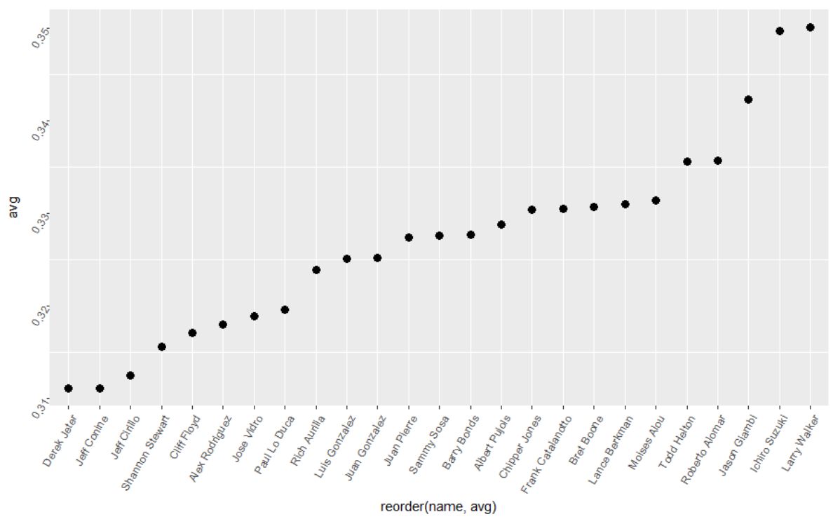 ggplot(tophit, aes(x=reorder(name, avg), avg)) +