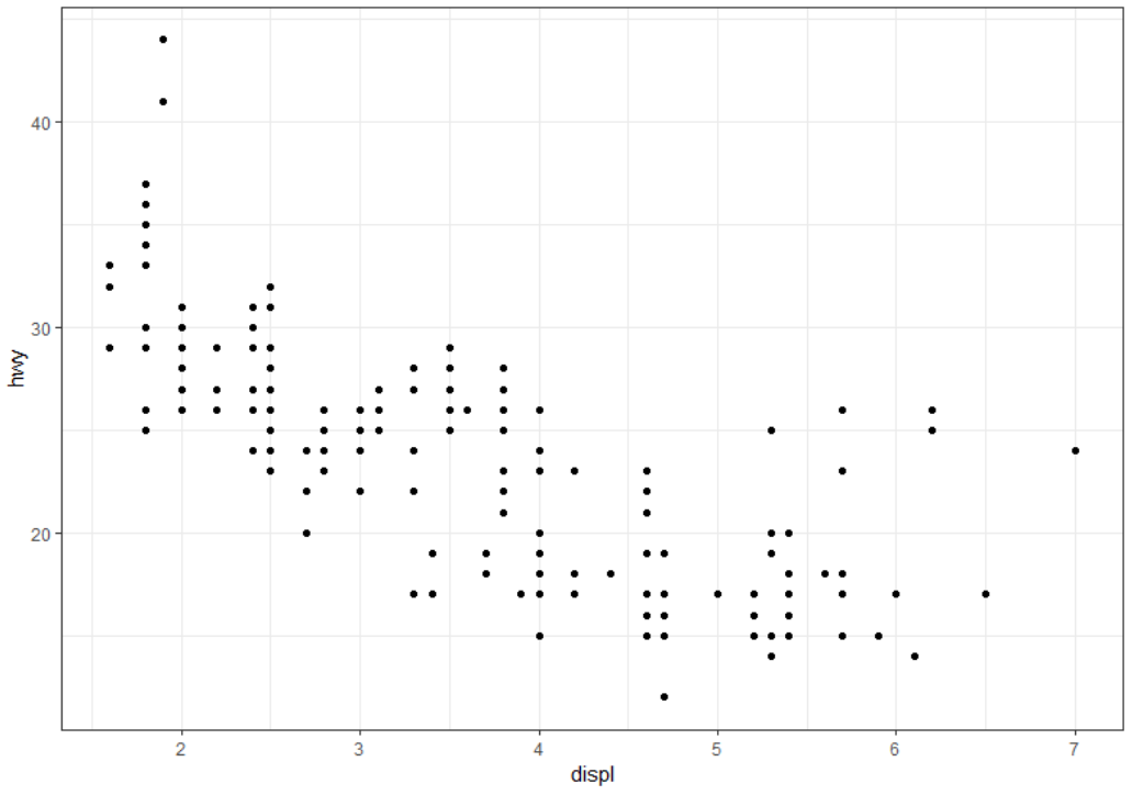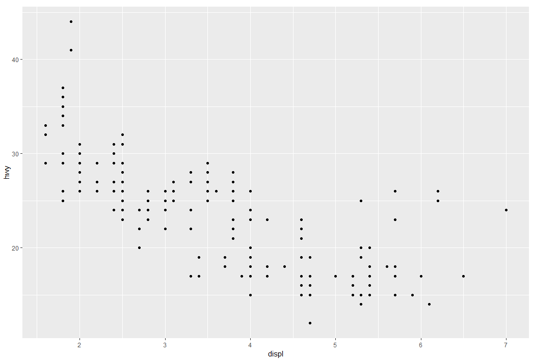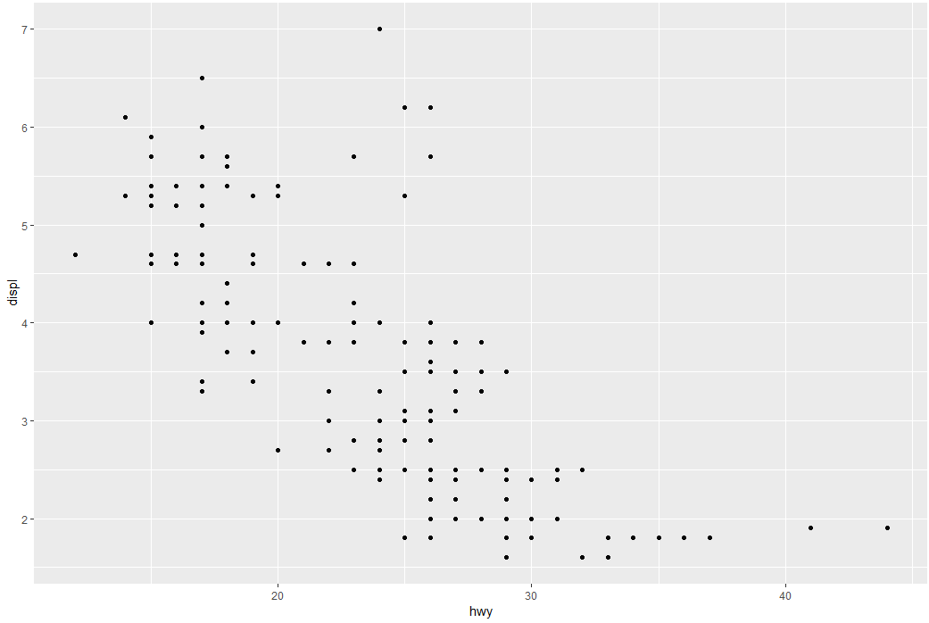 ggplot(data = mpg, mapping = aes(x=displ, y=hwy)) +