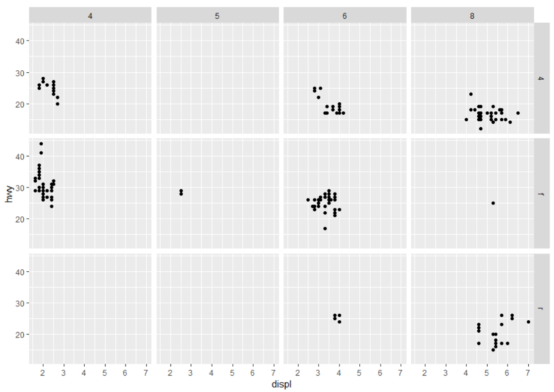 facet_grid(drv~cyl) #y축~x축 이2개 변수로 구분하여 플롯을 나눠그려라